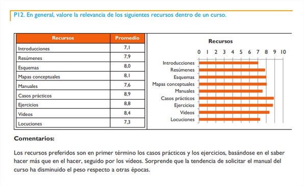 Lo primero que me llamó la atención es que algunos tipos de recursos se basan en la forma (esquemas, mapas conceptuales, manuales, vídeos, locuciones… ) y otros en la función (introducciones, ejercicios, casos prácticos, resúmenes), lo que seguramente sesga bastante la respuesta (si “mapa conceptual” es una categoría aparte, asumo que un “resumen” no va a ser en forma de mapa conceptual, cuando es perfectamente posible y hasta recomendable). Pero más interesante aún es ver cómo este sesgo puede hacer que los contenidos que solemos asociar con texto (introducciones, resúmenes y manuales) caigan a las últimas posiciones. Aunque casos prácticos y ejercicios pueden basarse en un texto, la orientación activa hace que suban a los primeros puestos. Que el vídeo esté en tercer lugar, por delante de alternativas como los esquemas o los mapas conceptuales, vendría a confirmar que, puestos a explicar algo, mejor no tener que leerlo.